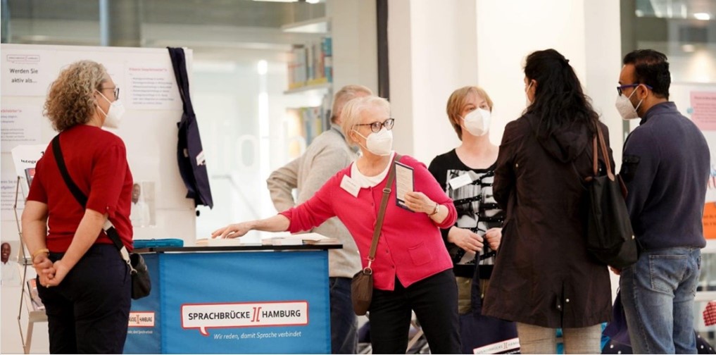 Die Freiwilligenbörse in der Handelskammer Hamburg ist fester Teil unserer Jahresplanung. Nachdem die Veranstaltung 2021 online stattfinden musste, konnten wir diesmal endlich wieder in den großartigen Sälen der Handelskammer persönliche Gespräche mit zahlreichen interessierten Ehrenamtlichen führen. Ein herzliches Dankeschön an alle Besucherinnen und Besucher, an die Sprachbrücken-Aktiven unseres Infostands sowie an das AKTIVOLI-Landesnetzwerk für die jährliche Organisation dieser tollen Austauschplattform.