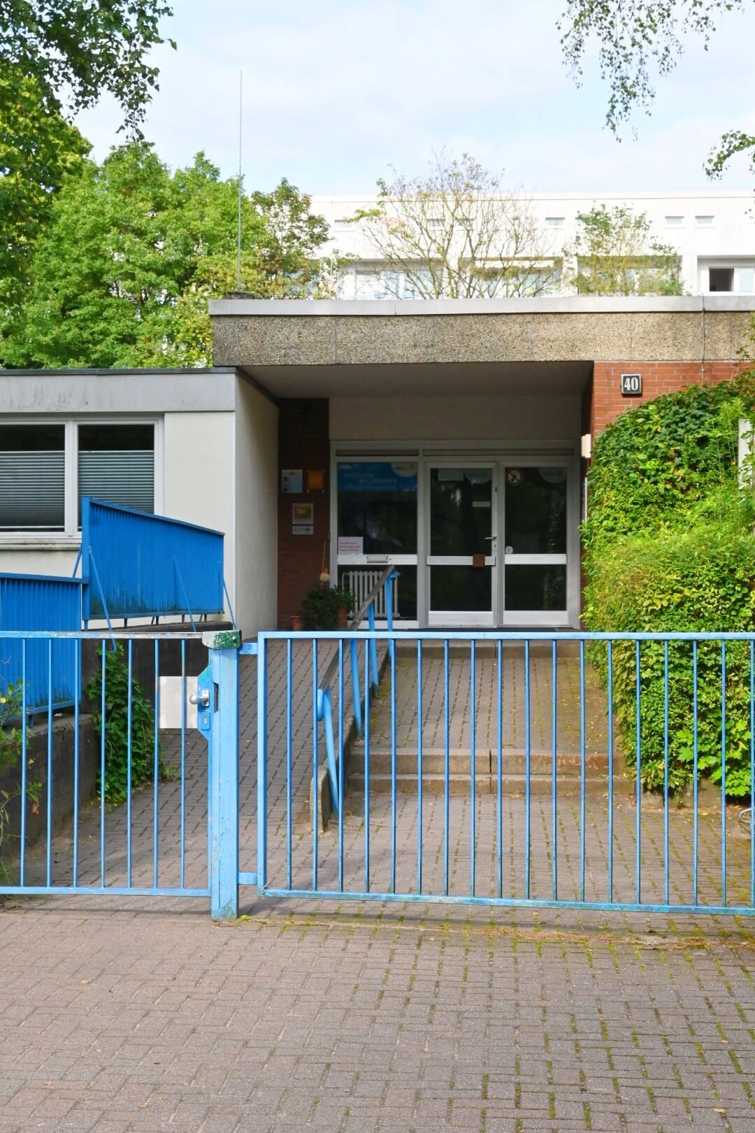 Die Haltestelle ist fast genau vor der Kita Spitzbergenweg. … Man geht dann durch die Kindertagesstätte (Kita) und durch einen Verbindungsgang. Und dann ist man schon vor dem EKiZ.