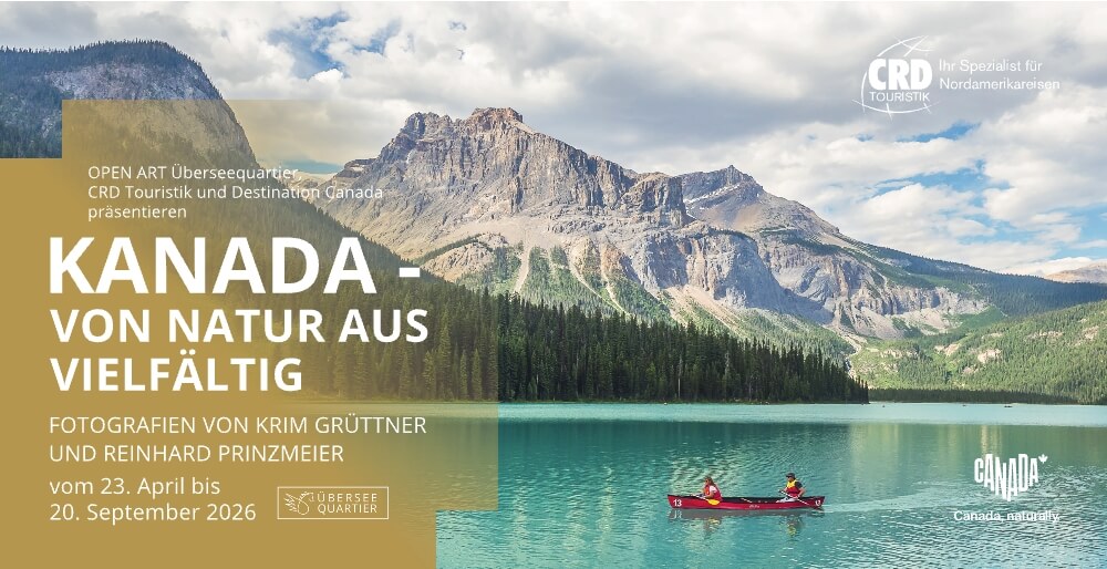 Auf dem Überseeboulevard in der Hamburger HafenCity präsentiert die 33. OPEN ART großformatige Fotos aus Kanada, die das Fotografenpaar Krim Grüttner und Reinhard Prinzmeier auf ihren bisherigen Reisen durch das zweitgrößte Land der Erde gemacht hat. Vom 23. April bis 20. September 2026 sind sie unter dem Titel „Kanada – von Natur aus vielfältig“ zu sehen.