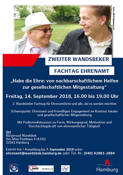 Bereits am 14. September 2018 fand der 2. Wandsbeker Fachtag Ehrenamt im Bürgersaal Wandsbek statt. Hier hatten Menschen aus Wandsbek und Umgebung Gelegenheit, sich über vielfältige Möglichkeiten ehrenamtlicher Tätigkeit zu informieren, um das passende Engagement zu finden. Zugleich gab eine ideenreiche Podiumsdiskussion und viele Kooperationsgespräche mit Organisationen aus verschiedenen Engagementbereichen. Wir freuen uns, dass wir unsere vielfältigen Mitmachmöglichkeiten hier noch bekannter machen konnten, und danken den Organisatoren das Bezirksamt Wandsbek, die AWO Hamburg und die AKTIVOLI Freiwilligenzentren Wandsbek & Volksdorf (AKTIVOLI Landesnetzwerk) für diese tollen Veranstaltung!
